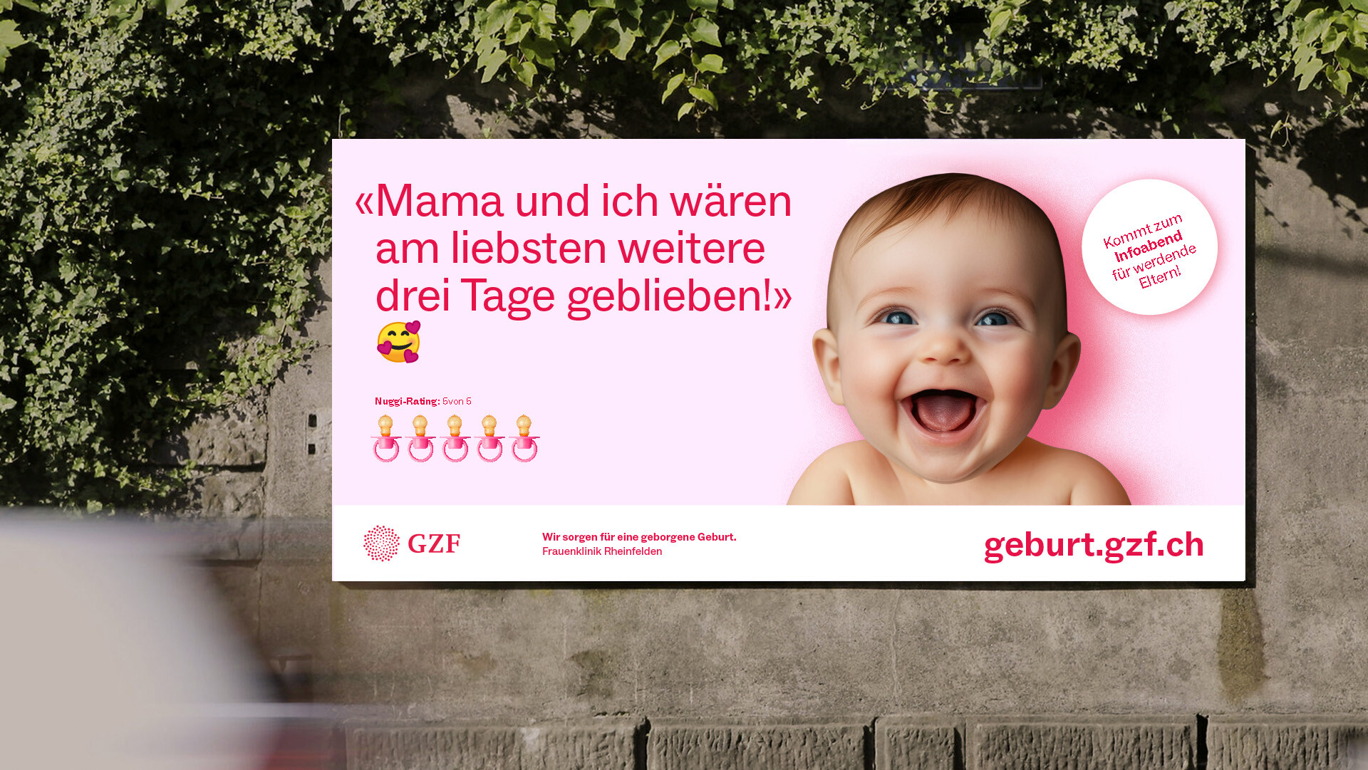 Das Gesundheitszentrum Fricktal (GZF) stand vor der Herausforderung, die einzigartigen Stärken seiner Frauenklinik in Rheinfelden hervorzuheben. In einem Umfeld, in dem werdende Eltern eine grosse Auswahl haben, reichten reine Fakten nicht aus. Es galt, die hohe medizinische Kompetenz mit den entscheidenden emotionalen Faktoren – Geborgenheit, Einfühlungsvermögen und eine familiäre Atmosphäre – glaubwürdig und aufmerksamkeitsstark zu kommunizieren und so die Bekanntheit gezielt zu steigern.